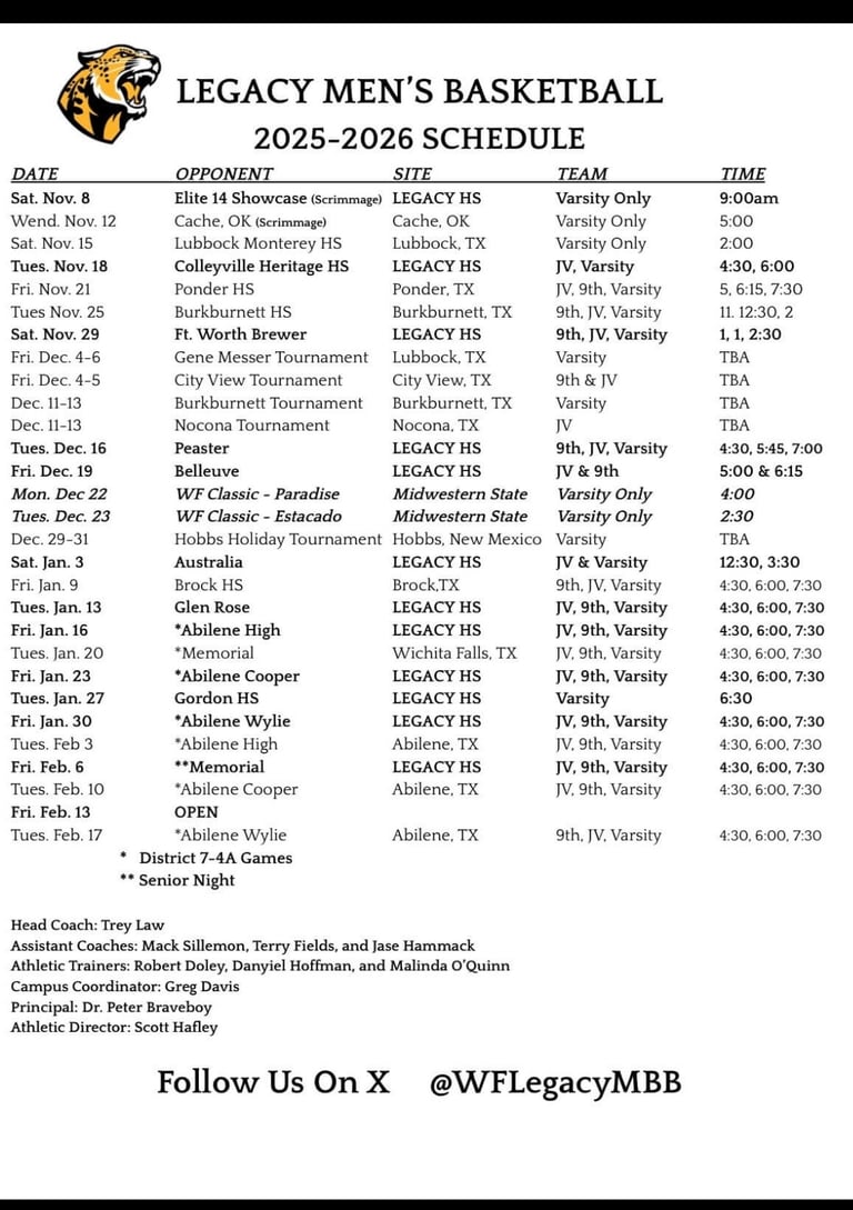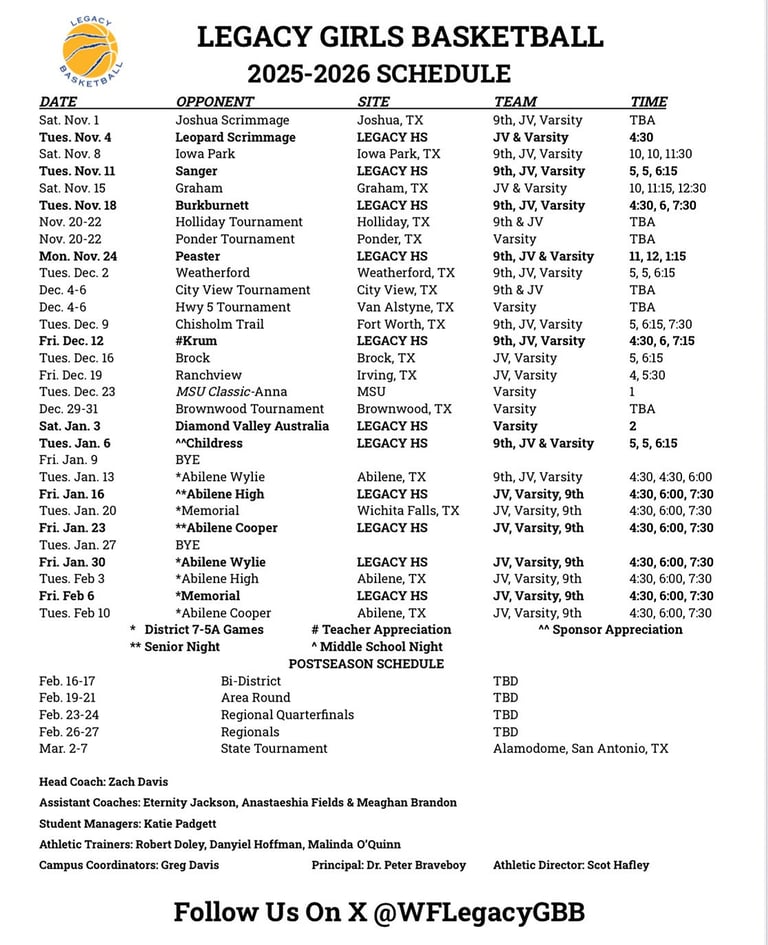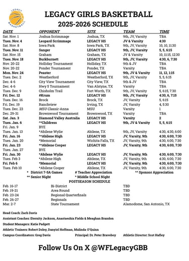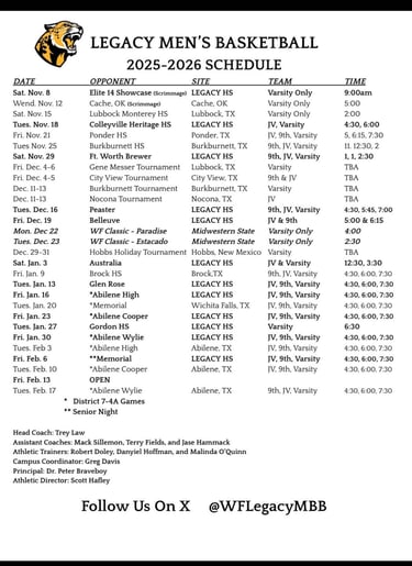 Stay updated on upcoming games and listen to live Legacy HS sports broadcasts.
